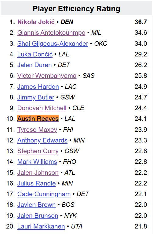 不仅如此,里夫斯目前的多项高阶数据都在联盟前15,包括PER值(24.1,联盟第10)、BPM(+5.0,联盟第15)、WinShares(+2.3,联盟第12).