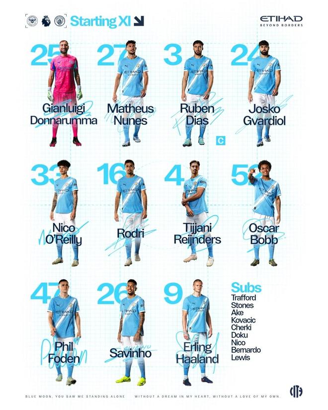 曼城首发:25-多纳鲁马、33-尼科-奥赖利、24-格瓦迪奥尔、3-鲁本-迪亚斯、27-马特乌斯-努内斯、16-罗德里、4-赖因德斯、52-奥斯卡-鲍勃、47-福登、26-萨维尼奥、9-哈兰德