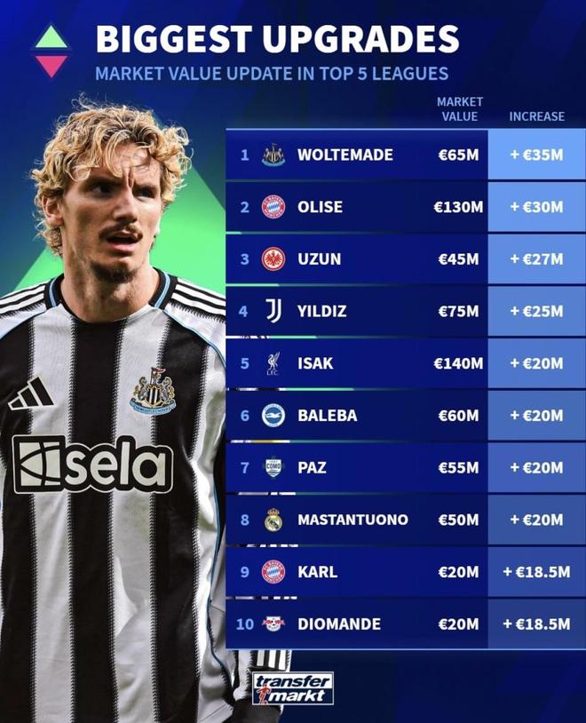 最新一期五大联赛球员身价涨幅榜发布 伊萨克这表现能涨2000万?